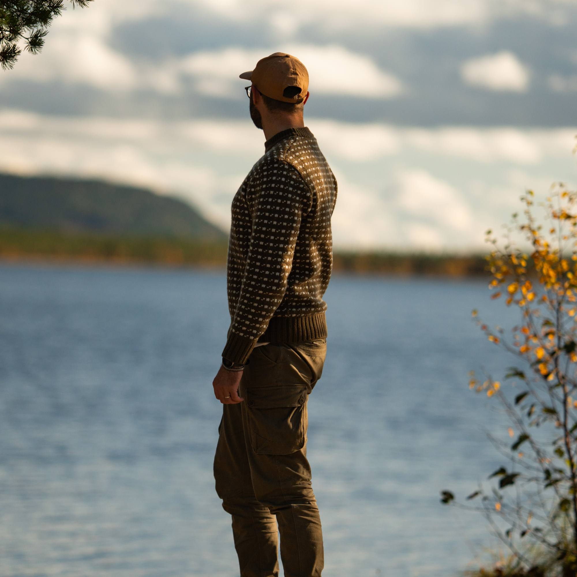 Crafted from lambswool sourced from Australia and reinforced with durable fibers, the sweater combines natural warmth and breathability with long-lasting strength. The wool regulates body temperature, wicks away moisture, and remains comfortable even during long days in the field. Reinforced stitching and a sturdy knit structure ensure it keeps its shape and withstands years of use.
