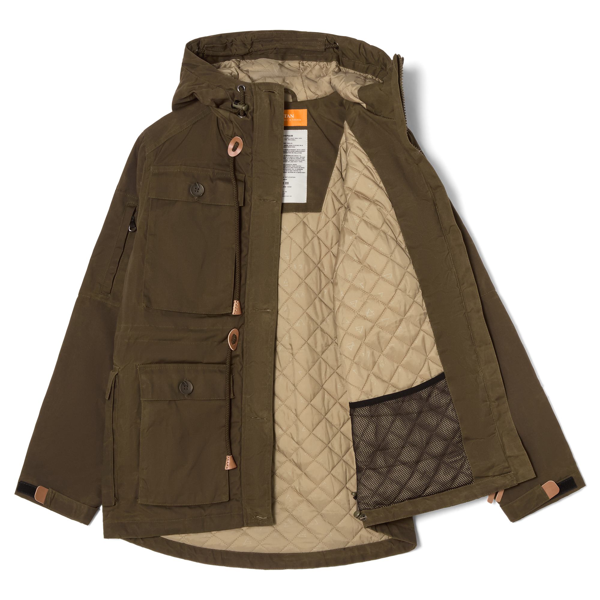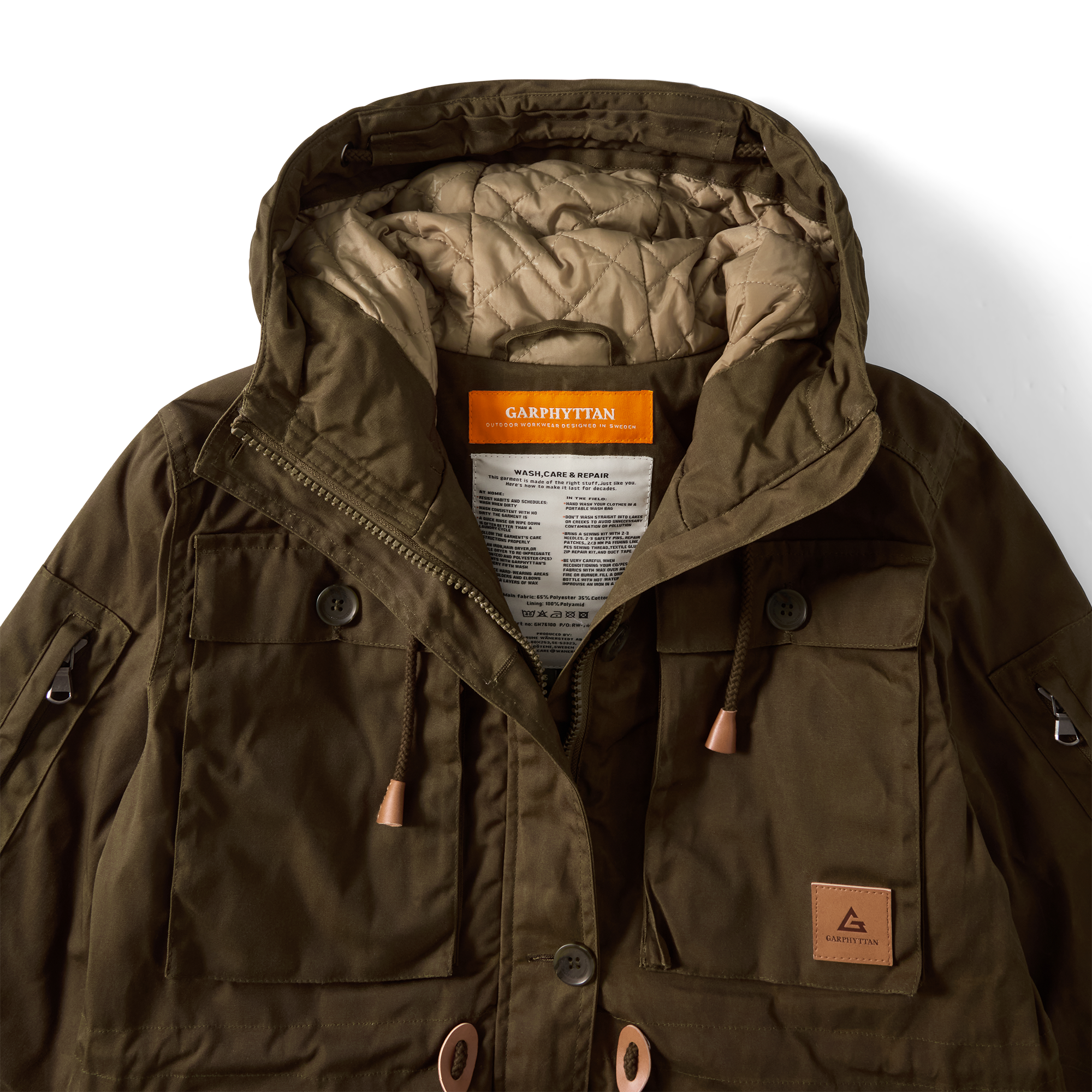 Förvaringen är utformad för att vara både praktisk och intuitiv: ärmfickor, dolda fickor med dragkedja, invändiga meshfickor och en bakficka som rymmer en vattenflaska. Dragkedjeöppningar i sidorna ger bättre ventilation och rörelsefrihet, och välgjorda detaljer som läderdragare, matta knappar och metalldelar ger jackan ett slitstarkt och diskret uttryck.