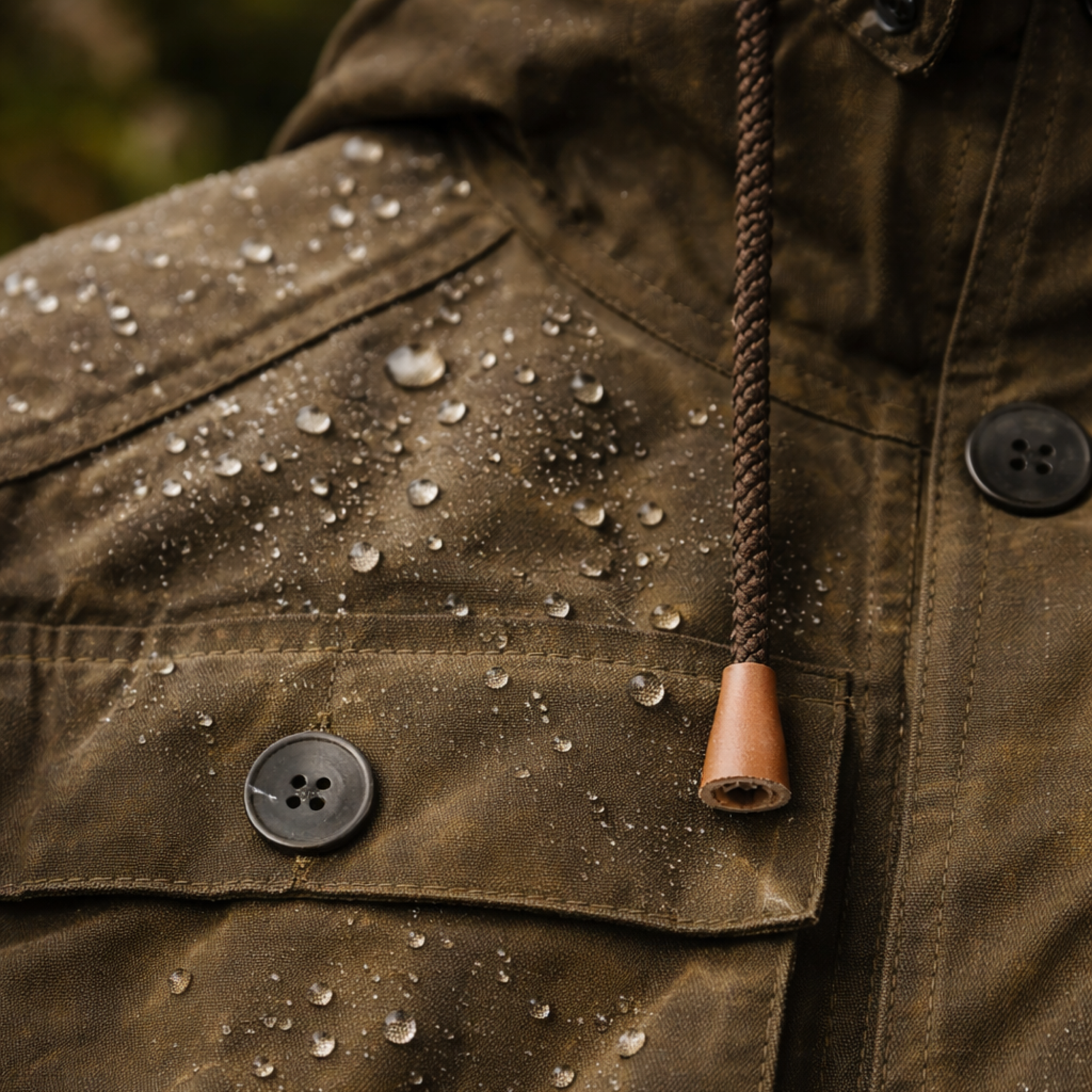 Yttertyg: 65 % polyester / 35 % bomull (220 gsm), vaxat två gånger för bättre motståndskraft mot vind och väta